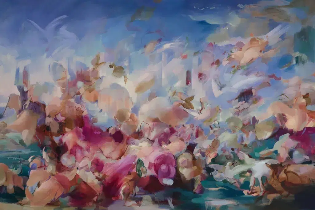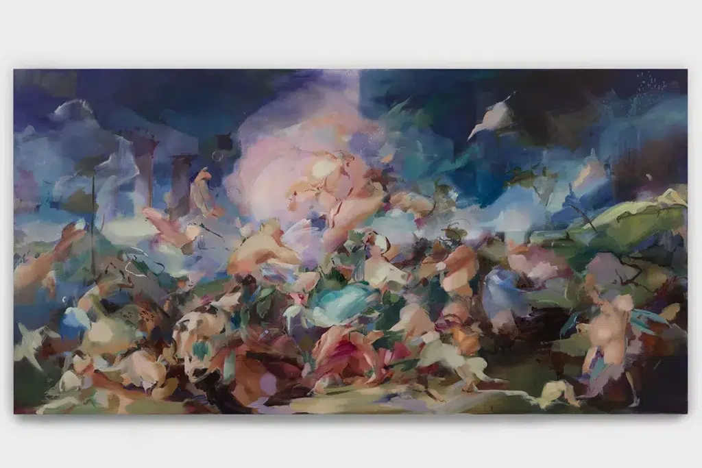 Dans « Bacchanalia », sa première exposition personnelle à Los Angeles, Yukhnovich choisit de s’attaquer à un mythe vieux comme les fêtes qu’il célèbre : la bacchanale, sa fureur, ses débordements, son ivresse. Elle ne peint pas la fête : elle illustre le moment où elle s’emballe, où les contours s’effritent, où la volupté commence à trembler. Ses toiles sont de vastes nappes de couleurs qui montent comme des marées sensorielles. Rien n’y est fixé, tout y flotte, migre, disparaît et revient. Le regard cherche un centre, mais la peinture le déplace sans cesse, comme une musique trop vive qui refuse de se laisser réduire à une seule note.