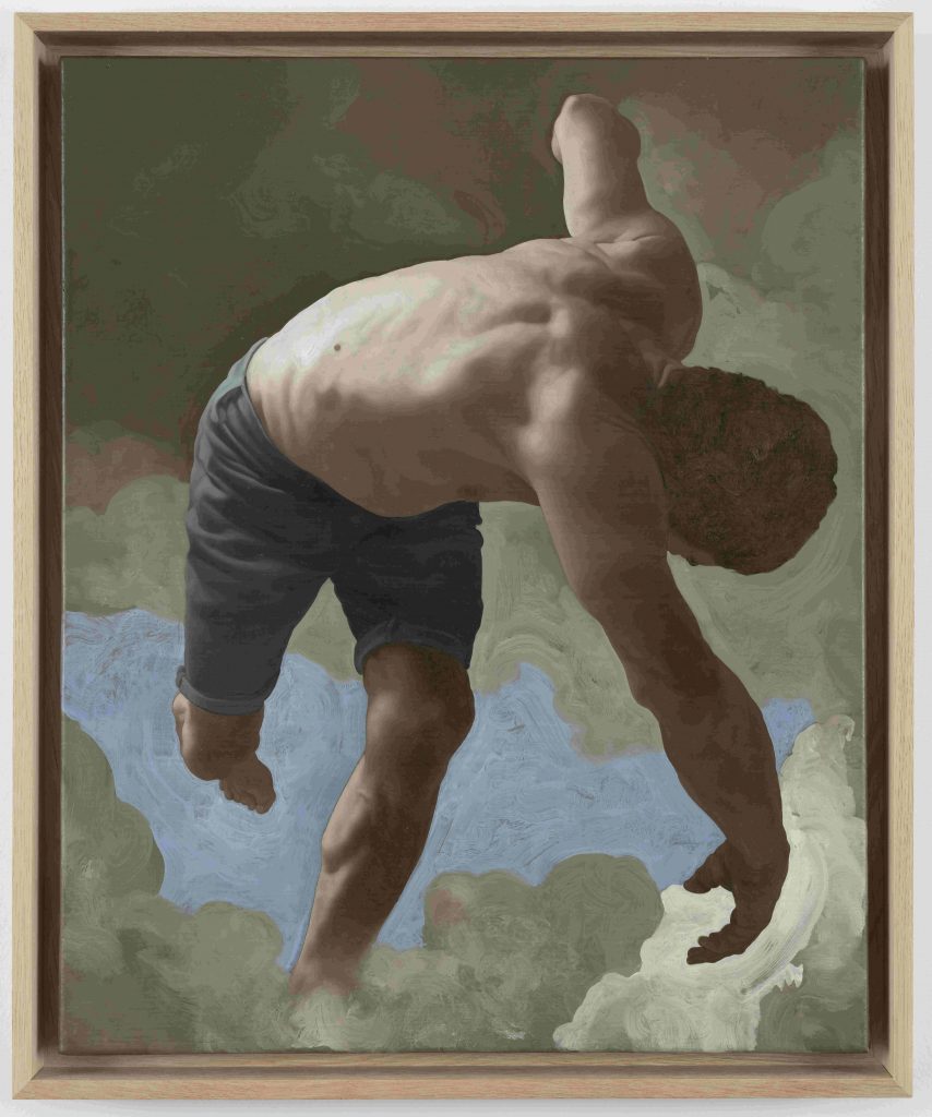 Sur des fonds noirs indéterminés, des mers démontées ou des ciels baroques surgissent des corps en train de chuter. S’ils n’étaient vêtus de jeans ou de joggings, et si leurs chorégraphies de volutes n’étaient émaillées de sneakers, on pourrait y voir les chutes des damnés des Jugements derniers de la peinture chrétienne. Contrairement aux séries précédentes de l’artiste situées dans des décors contemporains (parkings souterrains, gymnases et autres lieux désertés de banlieue), cette dernière est décontextualisée : hormis les t-shirts qui se sont substitués aux draperies, les corps, comme isolés, semblent se détacher des fonds intemporels pour s’abîmer dans l’immensité – du ciel ou de l’enfer…