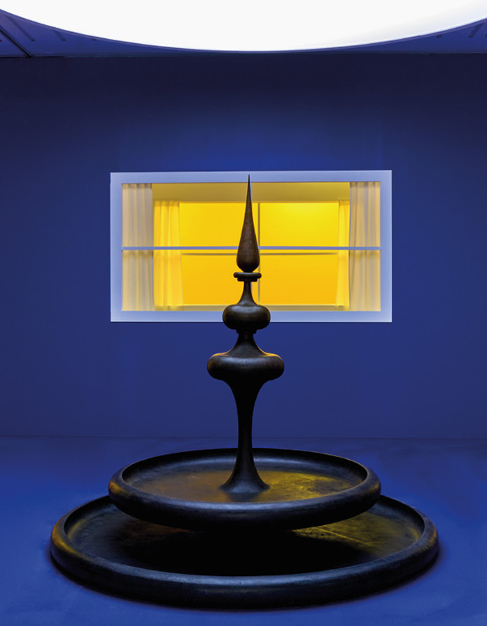Tels des gardiens, les quatre wagons en bronze de l’installation Soul Trains (2023) veillent sur les visiteurs. Endormis, leurs visages se contorsionnent, accablés par le poids d’un lourd traumatisme. À travers une petite fenêtre factice, une imposante fontaine en fer rouillée attire l’attention. Belly (2023) représente le corps voluptueux d’une chanteuse d’opéra. Tantôt protectrice, tantôt menaçante, la fontaine asséchée évoque une mort prématurée. À proximité, les visages longilignes de l’oeuvre Ô…Trees (2023) se dressent tels des cyprès dans une forêt.