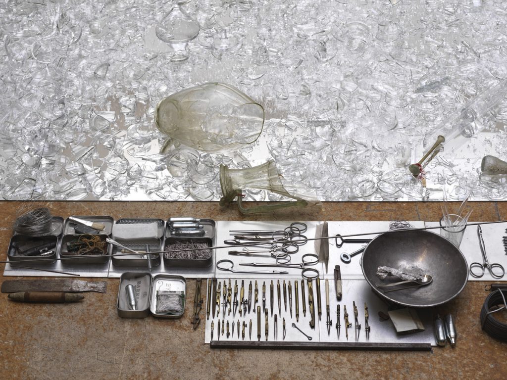 Frissons garantis dans la pénombre des sous-sols du Palais de Tokyo investis par Laura Lamiel. Magnifique par ses jeux de reflets et effrayante en même temps, la première installation de la plasticienne ne pourra vous laisser de glace : d’un blanc immaculé, une vaste étendue de verre pilé hérissée d’une chaise en métal posée de guingois brille de tous ses feux, et nous éblouit, tandis qu’en s’approchant, on s’aperçoit qu’elle est garnie de couteaux, de ciseaux, de porte-plumes, de lames, de vis et autres objets contondants, mais aussi de capsules de gaz hilarant clairsemées ou parfaitement alignées. Malaise…
