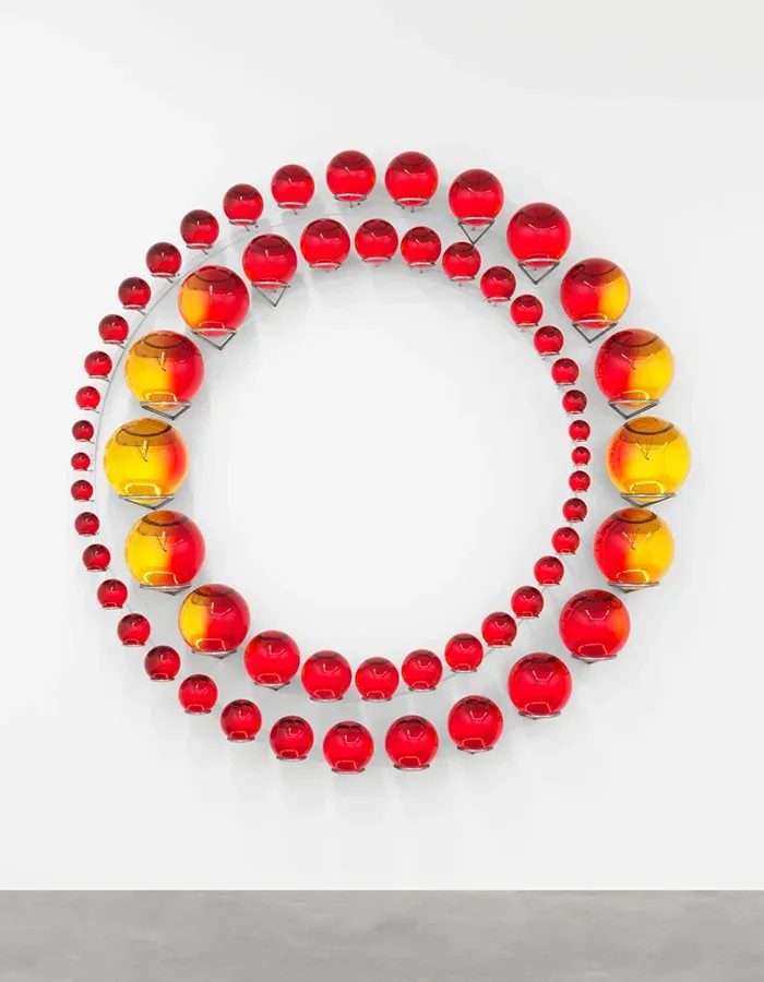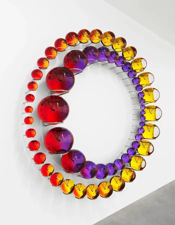 Le second artiste est Olafur Eliasson, représenté par la Galerie Tanya Bonakdar. Le pinceau n’est pas son outil de prédilection, Olafur maîtrise le verre avec délicatesse et précision. Avec son oeuvre “Successful Coexistence Beyond Earth » il apprécie le jeu qui existe entre la lumière et les reflets du verre qui changent selon la position du spectateur.