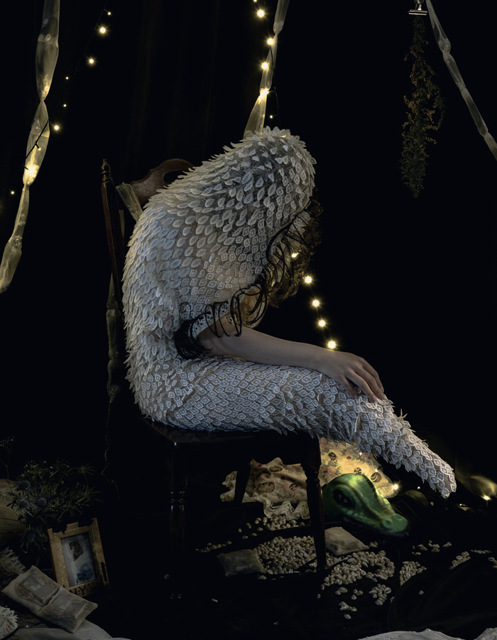 autoportraits photographiques où le merveilleux côtoie le douloureux et où l’intimité blessée touche à l’universel. Amputée des deux jambes à l’âge de neuf ans à cause d’une maladie congénitale rare ayant entraîné une malformation de la main gauche, Mari Katayama a fait oeuvre de son anormalité. Transgressant les canons de beauté, elle exhibe son corps abîmé, avec ou sans prothèses, sublimé par des atours et autres ornements ou accessoires qu’elle coud elle-même.