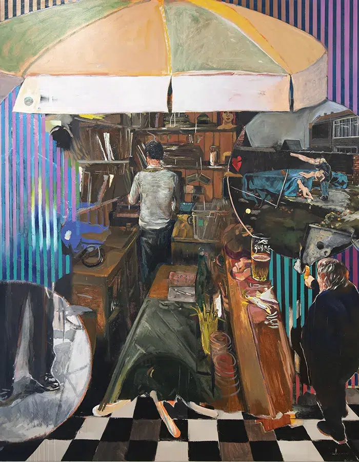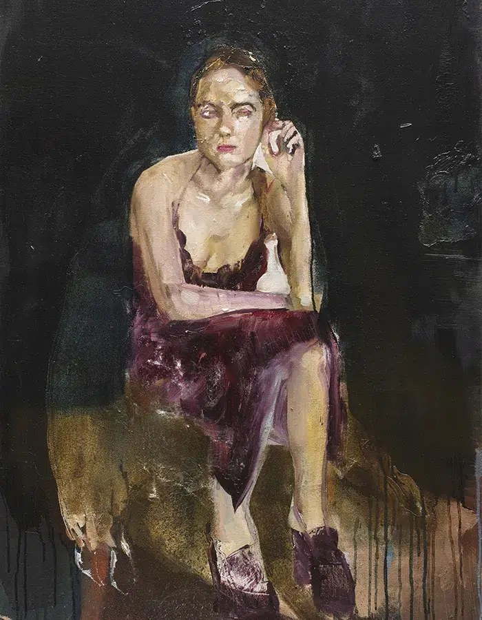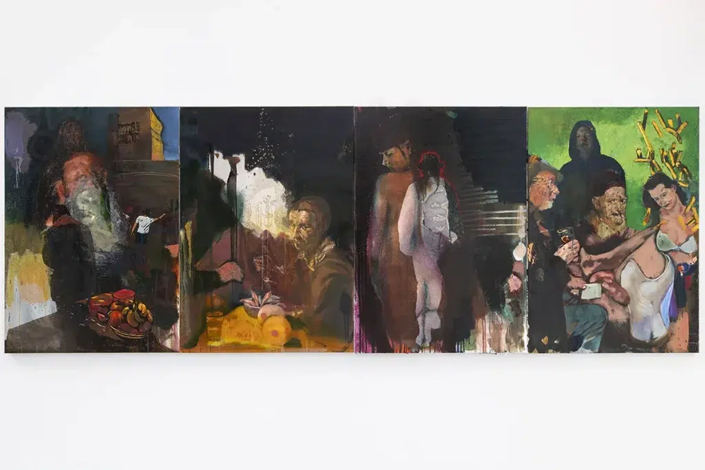 D’autres, plus petites, invitent à une proximité troublante : Self (40 × 30 centimètres), Portrait of Louise (102 × 72 centimètres) ou The Lies of Dylan (72 × 102 cm). Qu’elles soient monumentales ou discrètes, toutes partagent le même principe : laisser visibles les marques de la fabrication, les repentirs, les accidents. Ici, la peinture se montre dans sa nudité, avec ses failles et ses brisures.