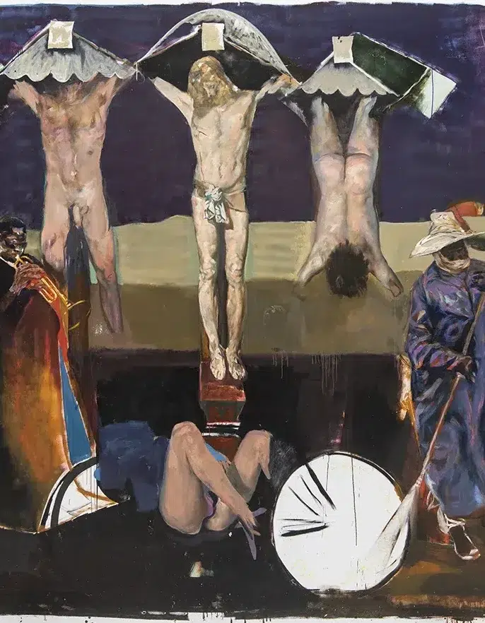 À côté de ces ombres prestigieuses, l’artiste convoque aussi des figures de l’art contemporain : les Américains Paul Thek, et David Hammons, ou le Colombien Oscar Murillo. Un mélange savant et instinctif, qui témoigne de l’éclectisme de son vocabulaire pictural.