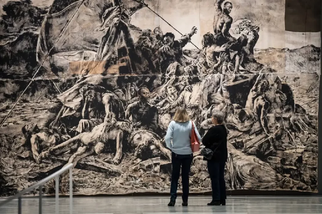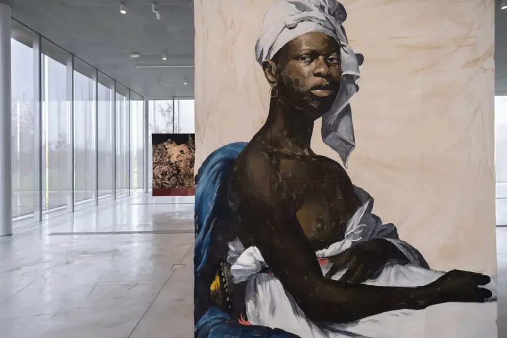 Le Pavillon de verre du Louvre-Lens laisse entrer la lumière comme on entrouvre un passé. Dedans, l’ombre travaille. L’exposition L’envers du temps de Roméo Mivekannin s’y déploie sans bruit, mais avec une densité rare. Les œuvres de l’artiste franco-béninois ne se contentent pas de réinterpréter les chefs-d’œuvre de l’art occidental : elles les renversent, les mettent en tension, les retournent sur leur face oubliée. Celle des corps absents. Celle des visages tus.