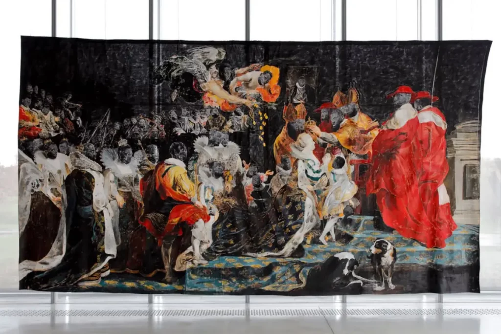 Ce travail m’a immédiatement fait penser à Kehinde Wiley, dans sa relecture brillante et frontale des portraits aristocratiques, et à Kara Walker, dans sa manière de détourner les figures pour les charger de noirceur, au sens politique du terme. Mais Mivekannin a autre chose : une lenteur rituelle, presque liturgique, qui renvoie aussi au travail de William Kentridge, dans cette manière d’extraire le politique du passé sans jamais sacrifier la forme.