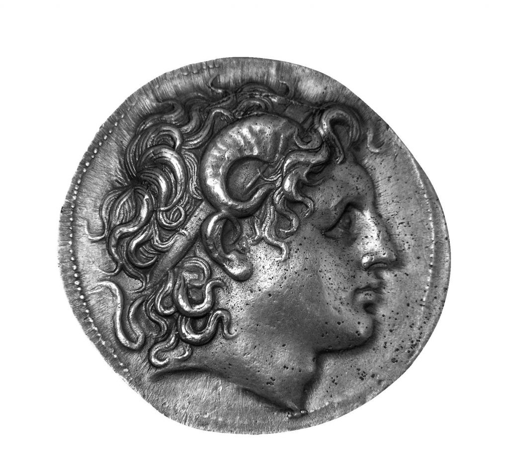Après sa mort, sur les pièces de monnaie, on représente souvent le profil d’Alexandre surmonté des cornes d’Amon, en signe de son caractère divin. C’est notamment le cas sur ce tétradrachme d’argent frappé sous le règne de Lysimaque.