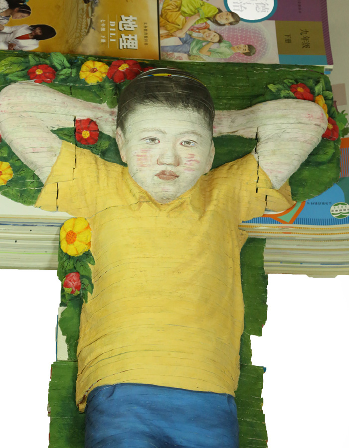 Merveilles tactiles et visuelles, les sculptures de Li Hongbo ne sont jamais ce qu’elles semblent être à première vue. L’artiste aime l’idée selon laquelle la réalité est toujours équivoque. Attisant la curiosité de son public, il lui rappelle que ce qu’il voit de ses propres yeux n’est toujours in fine qu’une interprétation. Ce qui semblait dur se révèle souple, ce qui était statique devient mouvant, ce qui offrait l’aspect d’une surface lisse se change en une écorce de papier rugueuse et alvéolée. Une inversion des valeurs qui transforme des bustes en plâtre réalistes en un long accordéon de papier, ou des sculptures aux couleurs chatoyantes et recouvertes de fleurs fraîchement écloses en une somme de livres empilés ! Avec Li Hongbo, le papier et les livres deviennent des matières pleines de surprises. Et ce ne sont pas ses oeuvres pour le moins étranges et troublantes qui diront le contraire ! Hommage à la force des esprits façonnés par la lecture, son travail bouleverse les coeurs. Espérons que nos vies révèlent autant de surprises que ces feuilles de papier…