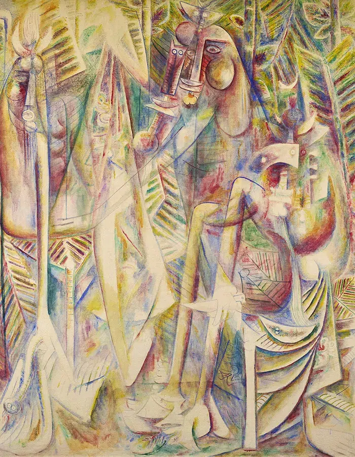 Le véritable tournant intervient lors de son retour à Cuba en 1941. Lam y opère une réinvention radicale de son langage pictural. Les figures hybrides, mi-humaines, mi-végétales, surgissent dans des compositions denses où le paysage devient un espace rituel. La jungla, œuvre emblématique conservée par le MoMA depuis 1945, ne relève ni de l’exotisme ni de l’abstraction pure : elle apparaît comme une condensation visuelle de l’histoire caribéenne, de l’esclavage aux spiritualités afro-caribéennes, dans une peinture à la fois sensuelle et inquiète.