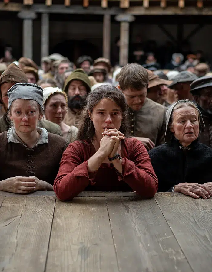 William Shakespeare, elle connaît. Diplômée de la Royal Academy of Dramatic Art de Londres, Jessie Buckley a été Miranda dans La Tempête, joué au prestigieux théâtre du Globe (reproduction du théâtre historique de Shakespeare, qui apparaît dans Hamnet) en 2013. On l’a aussi vue donner la réplique à Jude Law pour une mise en scène de Henry V dans un théâtre du West End et, plus récemment, interpréter Juliette aux côtés de Josh O’Connor (Roméo) dans une mise en scène de la plus fameuse pièce du Barde d’Avon pour le Royal National Theatre. Il faut dire que Jessie Buckley porte bien le costume. Certains acteurs et actrices peuvent paraître peu crédibles dans des fictions d’époque, en dépit de leur talent ; l’expression en vogue « iPhone face » résume bien la situation : leur visage a trop les traits d’un individu de la génération des iPhone. Pour Jessie Buckley, c’est tout l’inverse, et elle est immédiatement crédible dans une robe élisabéthaine, à préparer une potion à base de fleurs médicinales au fin fond d’une forêt du Warwickshire au XVIe siècle. Ce n’est pas un hasard si c’est son interprétation de la Princesse Maria Bolkonskaïa dans le Guerre et Paix de la BBC en 2016 qui l’a révélée au grand public. On pourrait aussi dire que son visage pâle et ses yeux légèrement en amande lui donneraient presque un air slave, russe (bien qu’elle soit en réalité l’arrière-petite-fille d’une figure de l’indépendance irlandaise, Madge Clifford). Elle a été ainsi parfaite chez Tolstoï comme dans la série Chernobyl, libre adaptation des récits de Svetlana Alexievitch sur la catastrophe nucléaire soviétique, où elle incarnait la femme d’un pompier parti parmi les premiers éteindre l’incendie de la centrale.