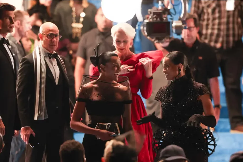 Miranda Priestly, elle, ne change pas fondamentalement, mais elle mue pour mieux régner sur son temps. On la découvre notamment dans une veste à pompons emblématique de chez Dries Van Noten, ainsi que dans un blazer noir et blanc rayé issu de la collection printemps 2026 de Schiaparelli. C’est un glissement significatif par rapport au premier film qui la drapait presque exclusivement en Hermès et Chanel. Les maisons de couture ont changé, les alliances se sont déplacées, mais le pouvoir, lui, reste intact et s’exprime à travers des coupes plus architecturales et subversives. Andy Sachs, de son côté, a définitivement rangé ses cuissardes Chanel mythiques au placard pour une approche plus intellectuelle de la sape. On la découvre dans un t-shirt épuré de chez Phoebe Philo, associé à un pantalon Nili Lotan, des chaussures Prada et des bijoux signés Jemma Wynne. Le look est simple, sophistiqué, totalement dénué de toute ostentation inutile. La métamorphose est là, mais elle se veut discrète. Andy a grandi, elle a pris du galon, et ses tenues le montrent désormais mieux que n’importe quelle ligne de dialogue.