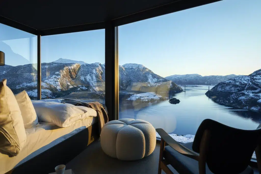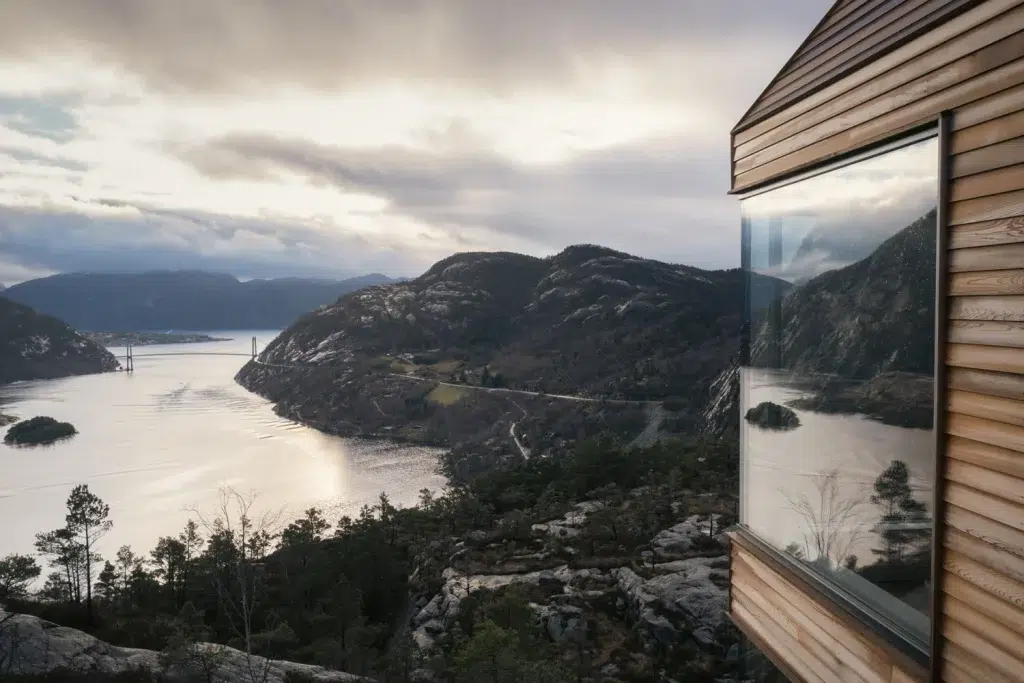 Après le succès remporté par ses deux premières réalisations, The Bolder Sky Lodges, l’entrepreneur Tom B. Norland, propriétaire du site en surplomb du Lysefjord, non loin de Stavanger, a décidé de voir plus grand : il a fait sortir de terre trois nouvelles cabanes beaucoup plus spacieuses et avec des normes environnementales plus exigeantes. En charge du projet, la célèbre agence d’architecture Snøhetta a limité au maximum l’impact sur l’environnement : les fondations reposent sur la roche et le bois utilisé provient de la forêt sur place. Les lodges se dressent au milieu des pins, littéralement au bord de la falaise. Avec leur forme asymétrique et leurs toits qui s’élèvent vers le ciel, ils semblent défier les lois de l’équilibre. Leur configuration à cinq faces et leurs baies vitrées du sol au plafond permettent une multitude de points de vue époustouflants sur la nature à grand spectacle. Chaque logement comprend une chambre avec un lit double, une salle à manger et une cuisine équipée griffée Vipp. Tom B. Norland a soigné l’aspect pratique autant que la féerie du lieu : « Le lodge est facilement accessible en voiture toute l’année. Mais c’est peut-être en automne, en hiver et au printemps que l’expérience est la plus magique. »