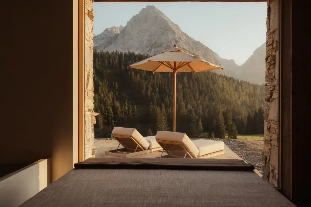 La Zugspitze, la plus haute montagne allemande, semble veiller du haut de ses 2 962 mètres sur la station d’Ehrwald, côté autrichien, et sur Eriro, le dernier né de ses hôtels de luxe ; l’un des plus petits aussi, avec seulement neuf chambres. Les architectes ont été missionnés pour développer un projet architectural original, respectueux de la nature et durable, avec une construction réalisée à 95 % à partir de bois, essentiellement issu de la forêt dans laquelle il est implanté. La lumière naturelle inonde les espaces intérieurs, volontairement épurés, dont les tonalités principales – gris, vert, brun – s’inspirent des paysages alentour. « Nous avons méticuleusement conçu chaque détail d’Eriro pour favoriser l’harmonie avec la nature », soulignent les propriétaires, Dominik et Amelie Posch. Leur souhait : décliner la culture et l’art de vivre du Tyrol dans tout l’hôtel, jusque dans le spa, avec ses soins à base d’arnica des montagnes et son sauna embaumant les aiguilles d’épicéa, et le restaurant, qui privilégie la cuisine au feu de bois. Les activités proposées entrent dans cette même philosophie d’immersion : randonnée, observation des animaux sauvages, VTT, cours de poterie, ou plus insolite encore, de yodel (un chant traditionnel du XVIe siècle)…