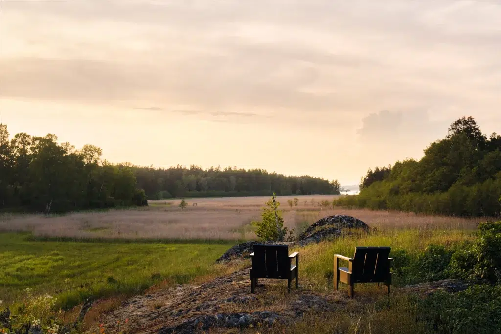 « Landet » en suédois signifie « campagne ». Cette retraite si bien nommée tient sa promesse avec une totale immersion dans l’une des contrées les plus préservées du pays, l’archipel de Stockholm. Préservée, mais pas coupée du monde : la charmante ville de Trosa est à quelques minutes et la capitale à moins d’une heure. Ainsi l’a voulu l’architecte suédois Andreas Martin-Löf quand il a conçu ses cottages contemporains, chics et écoresponsables, pour une clientèle de citadins en quête de déconnexion, sur un domaine de 400 hectares. De petits espaces (40 mètres carrés), mais tout confort et agréables à vivre. Les partis pris esthétiques du designer londonien Tobias Vernon, le mobilier scandinave épuré, le salon avec sa cheminée contribuent à créer une atmosphère douce et apaisante. L’idée de génie d’Andreas Martin-Löf ? Installer de part et d’autre une large baie vitrée donnant sur la nature, une vraie incitation à la contemplation : « Et pour que les cabanes se fondent dans l’environnement, nous les avons placées sur de simples socles, ce qui donne l’impression qu’elles flottent au-dessus des rochers. »