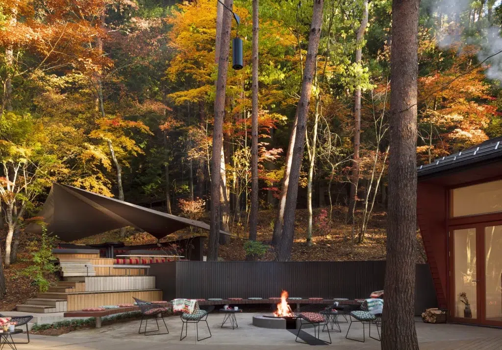 Premier hôtel de glamping au Japon, Hoshinoya Fuji se caractérise par ses designs volontairement minimalistes destinés à mettre en valeur le spectacle éclatant des couleurs saisonnières de la forêt de pins rouges dans laquelle il a posé ses cabines. Pour associer « glamour » et « camping », cet hôtel d’un genre nouveau propose de petits hébergements conçus comme des télescopes pointés vers le lac paisible qui leur fait face. On craque pour les vastes balcons entièrement meublés qui brouillent les frontières entre intérieur et extérieur. À proximité immédiate du mythique mont Fuji, inscrit au patrimoine mondial de l’UNESCO à la fois en tant qu’objet de foi et source d’art, Hoshinoya Fuji propose toute une série d’activités pour s’imprégner de l’atmosphère mystique du lieu. Au premier rang desquelles une balade en canoë pour admirer le reflet du Fujiyama à la surface du lac !
