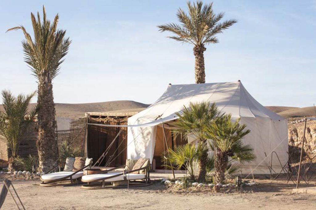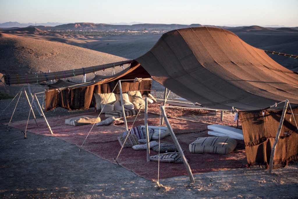 Ici, les hôtes séjournent confortablement dans des maisons traditionnelles ou des tentes typiques en bivouac, immergés en pleine nature. La présence de tapis berbères au sol, de chaises en osier et de tables en laiton argenté contribue à la pureté de la décoration et favorise une atmosphère d’intimité.