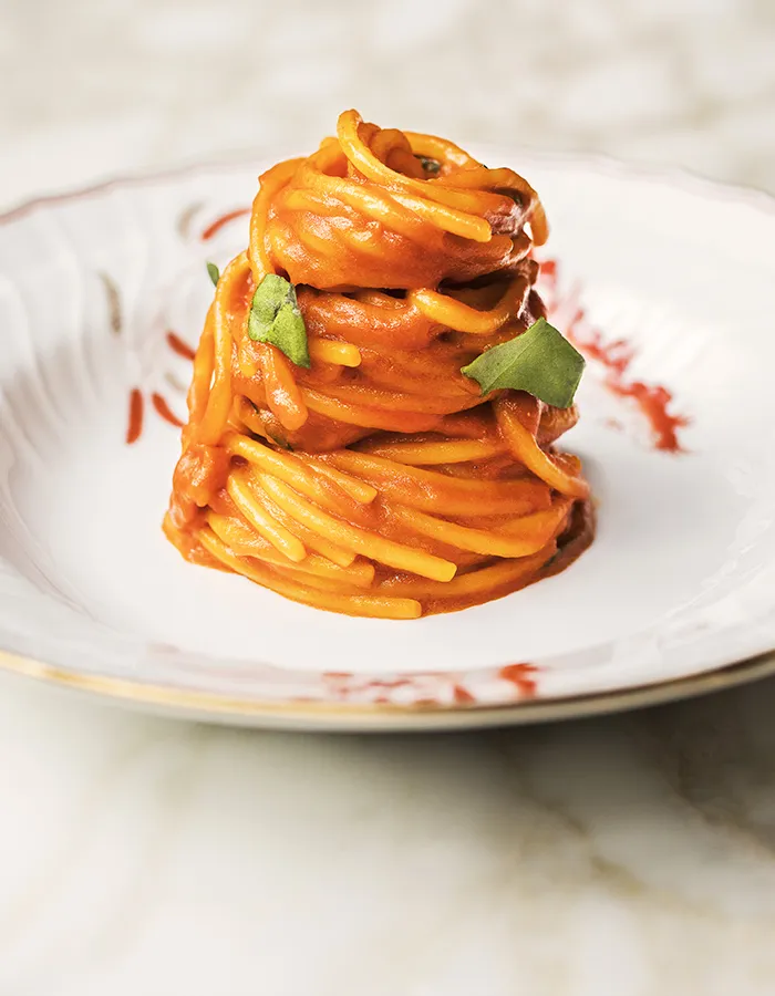 Les “Paffutelli alla Frank”, créés pour Frank Sinatra, voisinent avec des plats élégants et nostalgiques. On est dans un conte familial, un voyage dans le temps et l’espace, à la croisière de la mémoire et du plaisir.