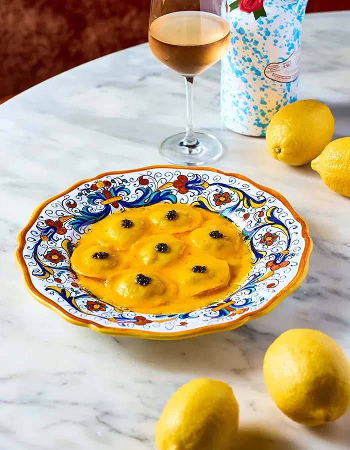 Après New York et Dubaï, La Baia ouvre enfin ses portes à Paris, faisant souffler sur la rue du Boccador un vent de dolce vita. Puisant son inspiration dans l’art de vivre amalfitain, ce restaurant au décor chiadé évoque l’élégance italienne avec une touche parisienne de glamour cossu. Banquettes et fauteuils habillés de tissus précieux font face à des tables de marbre sous des lustres majestueux, tandis que les moulures et le parquet parisiens ajoutent encore davantage de cachet. Dans ce lieu grandiose, on vient découvrir la belle cuisine côtière du Sud de l’Italie. Imaginée par le chef Stefano Tortelli, la carte transforme les saveurs transalpines gourmandes en des créations réjouissantes. Au menu, le Carpaccio di Manzo da Condividere, un fabuleux carpaccio de bœuf fondant escorté d’artichaut, truffe et parmesan ; les Fiori di Zucchina con Bufala, de délicates fleurs de courgette généreusement garnies d’une excellente mozzarella de bufflonne et anchois ; ou le Vitello Tonnato, de fines tranches de veau juteux, cachées sous une sauce tonnato d’exception. Évidemment chez La Baia, la pasta est en état de grâce. On vous conseille les Tagliatelle « La Baia », une recette signature du chef, qui enrobe les pâtes maison dans une onctueuse sauce à la truffe. Les Ravioli al Granchio e Caviale, raviolis au crabe cuisinés dans une sauce au beurre et safran et sublimés par une touche saline de caviar, valent également le détour. De quoi offrir un été sans fin à l’hiver parisien…
