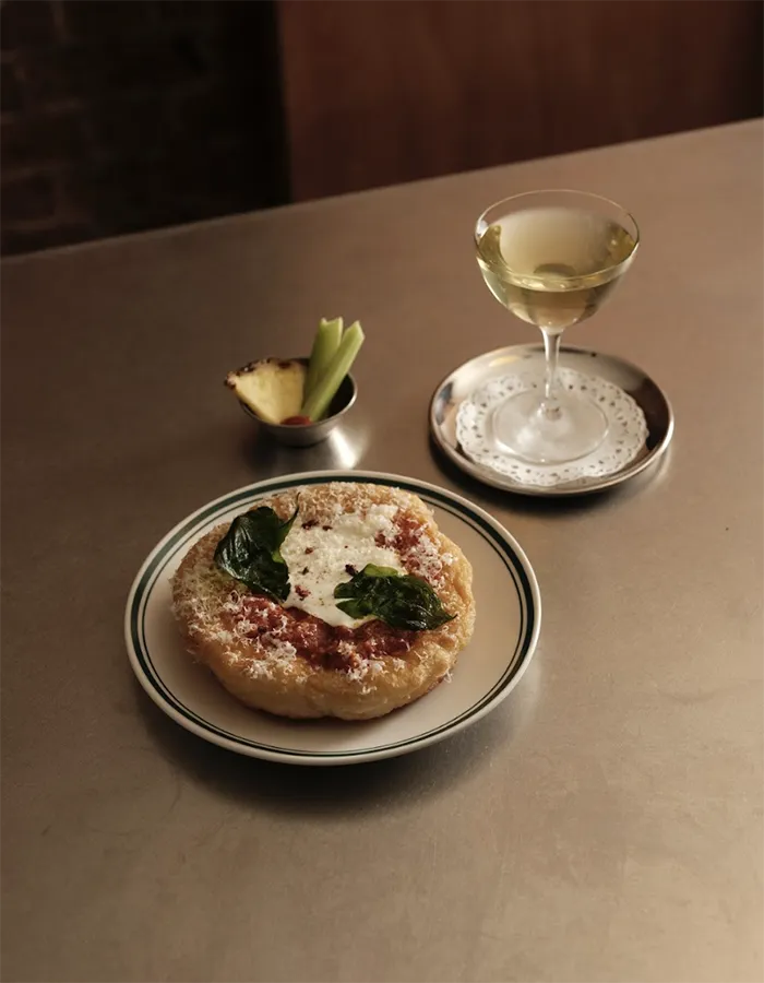 La carte des cocktails s’organise librement autour de différents moments de la journée, sans contrainte horaire. Parmi les créations, le PP&B Milkshake revisite le milkshake américain dans une version adulte mêlant bourbon, banane et beurre de cacahuète, relevé d’une chantilly fumée. Le Fortunella Spritz combine influences nordiques et amertume italienne, avec aquavit, Aperol, kumquat et bière houblonnée. En cuisine, Delphine Laguerre développe une proposition généreuse et cosmopolite, pensée pour accompagner les cocktails comme pour constituer un repas à part entière. Parmi les signatures, le super dog associe saucisse de volaille, cheddar fondu et gravy à la Guinness, tandis que la puff pizza ricotta, harissa et miel joue sur le contraste des textures. La salade César revisitée, les pâtes au ragù bianco fondant ou encore les desserts réconfortants, comme le pudding sarrasin à l’orange ou le chocolate cake à la Guinness, prolongent cet esprit de gastropub contemporain.