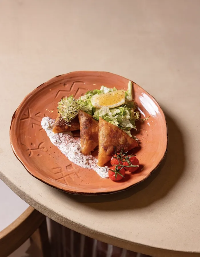 La dégustation commence avec la soupe épicée au blé vert fumé, un plat profond et enveloppant dont les notes boisées se mêlent à la tendreté de la viande mijotée et à la douceur des légumes. Les pois chiches apportent du relief, tandis que les herbes fraîches signent une finale vive et parfumée. Viennent ensuite les boureks croustillants, dorés à souhait, révélant tour à tour une farce gourmande de bœuf ou une version poulet-olives plus ensoleillée. Pour conclure, les gâteaux aux amandes et à la pistache offrent une touche sucrée raffinée, entre fondant et léger croquant, aux accents de fruits secs torréfiés et de miel.