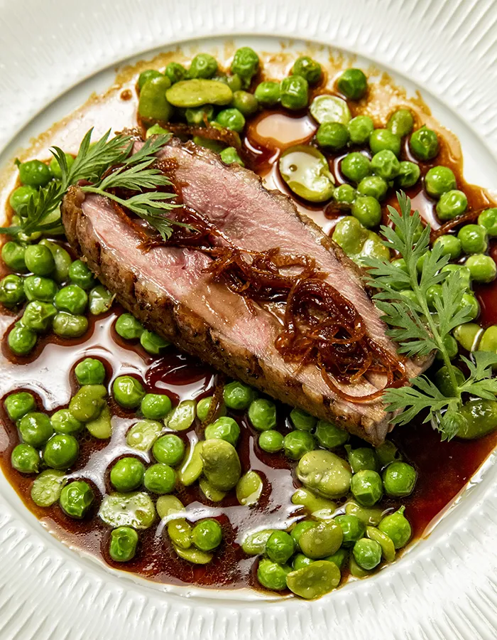 La dégustation débute avec une tartelette de poireaux à l’anguille fumée et mayonnaise verte, délicate et équilibrée, où la douceur végétale du légume rencontre les notes subtilement boisées du poisson. La texture croustillante de la pâte contraste avec le fondant de la garniture, tandis que la sauce herbacée apporte une fraîcheur vive. Le rouget grondin prend ensuite le relais avec élégance : sa chair fine et nacrée se marie à la douceur des carottes relevées d’une pointe de gingembre, le tout lié par un jus de homard profond et parfumé qui enveloppe l’assiette d’une intensité iodée maîtrisée.