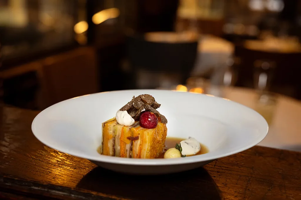 La cuisine est orchestrée par le chef Alessandro Fornaro, sous l’impulsion de Massimiliano Alajmo, figure majeure de la gastronomie italienne. Ensemble, ils défendent une approche centrée sur la pureté du produit et la lisibilité des saveurs : radicchio aux haricots, raifort aux pommes et sauce verte, bar rôti avec purée de pommes de terre citronnée et légumes de saison, millefeuille de légumes d’hiver à l’huile d’olive extra-vierge et truffe noire, sélection de trois fromages italiens avec pain toasté et confitures, ou encore beignet aux pommes accompagné d’un nuage de sabayon. Une expérience qui assume pleinement le standing de son décor et de sa signature culinaire.