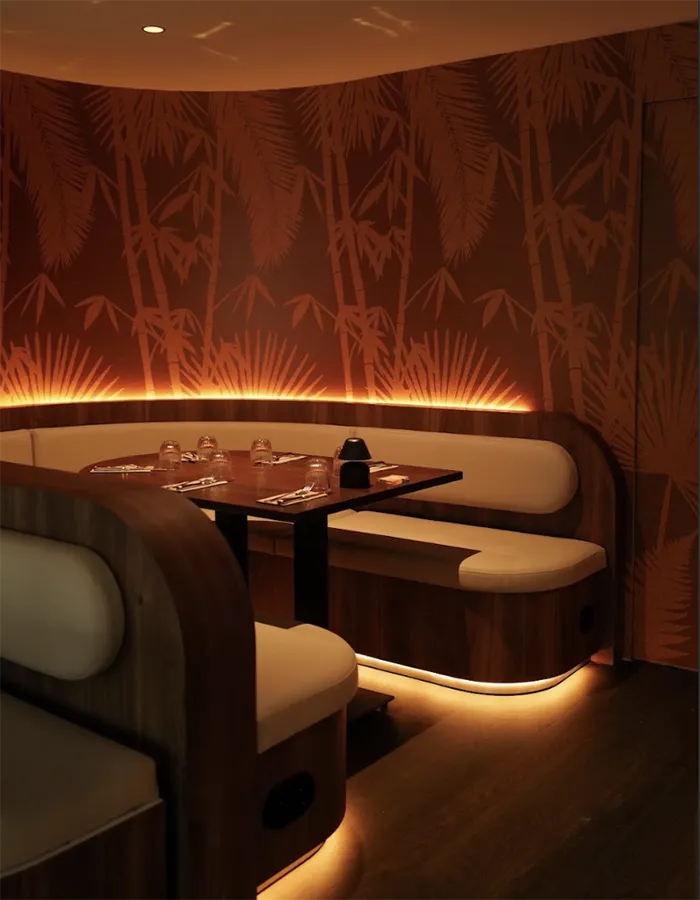 Institution nikkei à Paris, Manko propose une expérience où se rencontrent avec intensité les cultures péruvienne et japonaise. Le décor, scénographié par le cabinet Bureau Lacroix, compose un véritable théâtre gastronomique : banquettes bleu nuit bordées d’or, claustras ajourés inspirés du Japon et mosaïques lumineuses autour du Ceviche Bar, dans un jeu maîtrisé de matières nobles et de lumière.