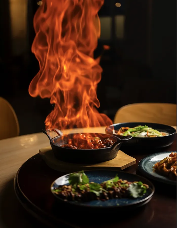 Le chef Olivier Lin propose une cuisine chinoise récréative, fondée sur l’équilibre des textures et la lisibilité des saveurs : aubergines chinoises marinées dans une vinaigrette secrète relevée d’huile de piment maison et d’herbes fraîches ; bing traditionnels garnis de pousses de soja et de légumes ; tataki de bœuf aux accents du Sichuan, accompagné de tofu grillé, chou chinois sauté et coriandre ; ou encore nouilles de riz froides à la sauce cacahuète maison, relevées d’huile de sésame, citron vert et cacahuètes concassées. En dessert, le mango sticky rice est revisité dans une version contemporaine, mêlant riz au lait de coco, gel mangue-passion, basilic thaï et mousse aérienne coco. Les tarifs correspondent à une table technique, où la maîtrise culinaire prime sur l’effet spectaculaire.