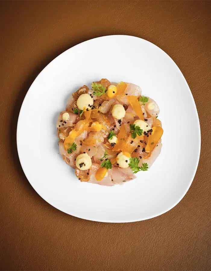 Au centre de la salle, le Ceviche Bar symbolise ce dialogue culinaire. Véritable scène dédiée au travail du cru, il met en lumière tiraditos, crudos et cebiches réalisés à la minute, où la netteté de la découpe, la vivacité des agrumes, l’intensité de la leche de tigre et la fraîcheur des herbes composent une partition précise et vibrante.