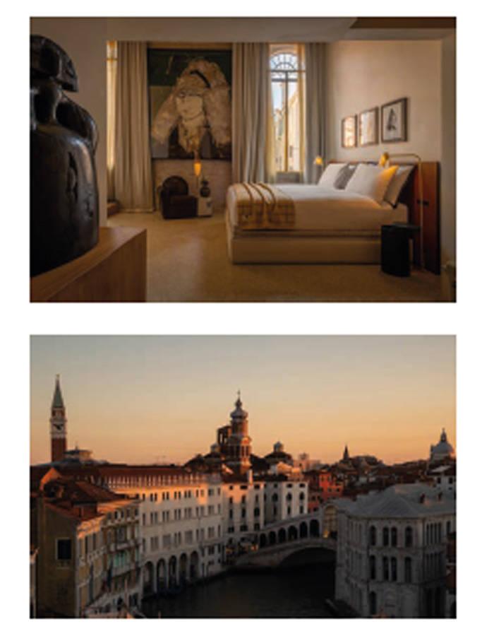 sculpturaux en céramique ou en résine. Les collaborations avec des maisons emblématiques du secteur contribuent à créer le caractère unique de ce lieu, du système d’éclairage sur mesure créé pour The Erose avec iGuzzini à la baignoire Agape conçue par Patricia Urquiola, en passant par le modèle emblématique de téléviseur grand écran de Bang & Olufsen – réédité exclusivement pour The Venice Venice Hotel – ou encore l’élégant