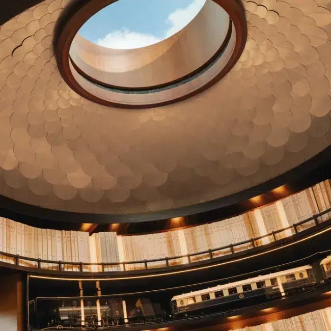 Le bâtiment se veut aussi brut que du champagne ; planté dans un sol de craie et d’argile, il se situe à la frontière du Parc National de la Montagne de Reims sur un promontoire à 240 m d’altitude. L’architecte Sanjit Manku qualifie le projet de « mix de pétillement et de plaisirs simples ». La structure est élevée sur des fondations en béton minéral et recouverte de bois. Elle est légère et transparente comme une bulle. Le bâtiment est scindé en deux blocs de sorte que les perspectives diffèrent. La nature entoure les 101 chambres de l’hôtel spa. Le premier étage, conçu autour d’une cheminée centrale, est composé d’une sculpture aérienne en métal perforé qui s’élève telles des bulles évanescentes le long de l’escalier monumental. La thématique du champagne est donc bien respectée. Les chambres quant à elles sont situées dans la deuxième partie du bâtiment, offrant une vue imprenable sur l’orée du bois et de la forêt. Le toit de cet hôtel est en béton et végétalisé ; recouvert de bois, il se fond dans la végétation, comme s’il en était une extension architecturale. Le design intérieur de l’établissement est à la fois naturel et élégant. Ce bâtiment est entièrement dédié à la beauté et à la diversité du terroir champenois, par une approche différente des lieux habituellement dédiés à la dégustation de champagne. Le Loisium propose une dégustation de champagne au sein même des vignes où ce dernier est produit. Un lieu de rencontre où les acteurs locaux peuvent échanger avec leurs visiteurs. Une adresse pétillante parfaite pour les fêtes de fin d’année.
