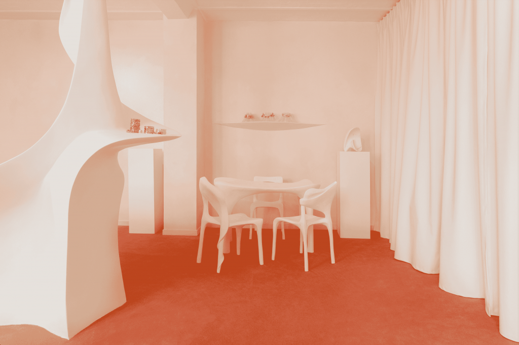 Au fil des années, cette joaillière de formation a développé des compétences de designer avec l’ouverture de sa boutique-galerie. Entre la moquette rose et le mur de miroirs reflétant la lumière, la sculpture posée au centre s’impose tout en légèreté avec un motif torsadé faisant allusion aux formes de ses créations.
