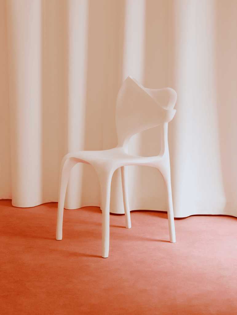 Dans un esprit de recyclage, Annelise Michelson a pensé des chaises à partir de mobilier déjà existant sur lequel les artisans viennent déposer du plâtre ; une matière qui permet de créer en toute flexibilité et d’ajouter ou de retirer une couche tout en conservant un côté minéral et pur, mais en laissant apparaître une finesse certaine. De ce dialogue entre l’atelier et la créatrice naissent des pièces épurées aux courbes naturelles.