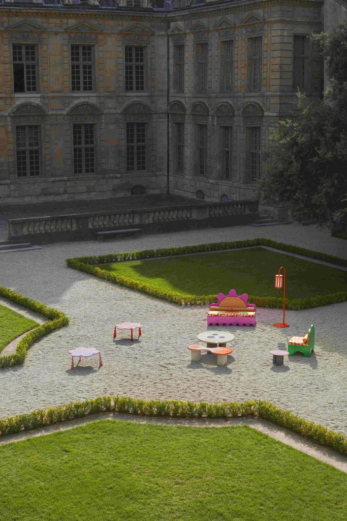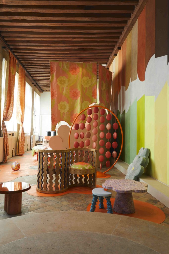 Installé dans l’Orangerie de l’Hôtel de Sully, le collectif multidisciplinaire créé par Julien Sebban avait un objectif : explorer la couleur, les motifs et les formes dans un ensemble joyeux, tout en faisant rayonner les savoir-faire traditionnels français. Parmi les pièces à ne pas manquer, le paravent réalisé par Atelier Roma, le lit rond du Lit National, ou encore les tissus de la Manufacture Prelle revisités par Uchronia.