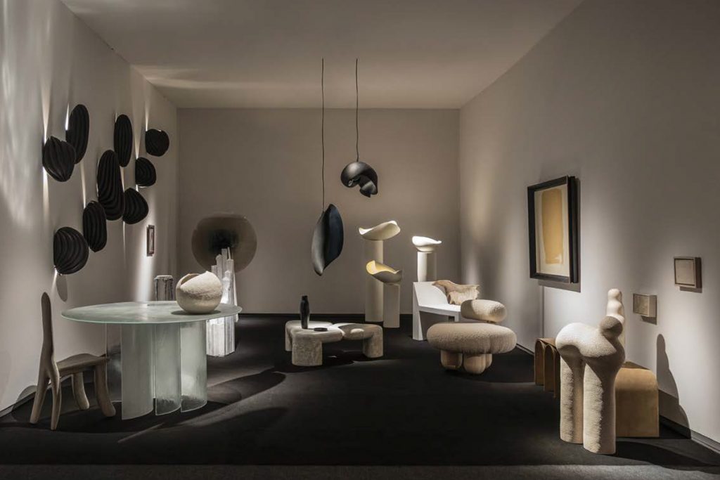Avec « Contrasts », la Galerie Philia s’est invitée pour la première fois au salon londonien. En plus d’une peinture à l’huile signée Nicolas de Staël, la galerie internationale a présenté aux amateurs de design trois pièces du designer italien Pietro Franceschini, un candélabre en marbre du designer mexicain Andrés Monnier, une table signée par le duo de designers italiens Studiopepe ainsi que la très singulière Tomb Chair de Rick Owens, conçue en marbre et décorée d’un bois d’élan. Une présentation complétée par les appliques et lampadaires en céramique d’Elsa Foulon.