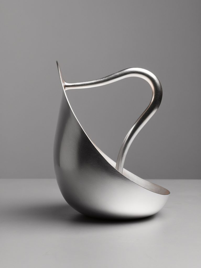 Étonnante pièce conçue en argent massif. Si, à première vue, de face, elle nous évoque des natures mortes flamandes, un coup d’œil vers sa partie arrière dévoile une délicate anse qui vient se perdre dans un décolleté à la Mireille Darc.
