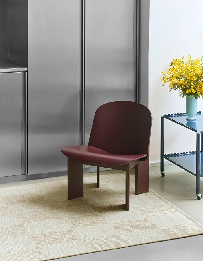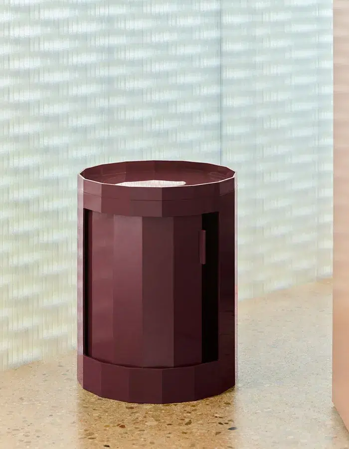 Les éditeurs de design scandinaves et italiens ne s’y trompent pas. Chez HAY, l’aubergine prend des allures de géométrie lustrée sur un guéridon aux facettes angulaires : un ton riche, presque gourmand, qui absorbe la lumière tout en la reflétant délicatement. Normann Copenhagen explore la même tonalité sur des assises aux lignes franches, conférant à leurs volumes minimalistes une densité inattendue. Chez Hem, la couleur enveloppe un fauteuil sculptural d’un velours dense, évoquant à la fois la modernité et la mémoire du mobilier des années 1970. Quant au label The Socialite Family, toujours attentif aux résonances émotionnelles des matériaux, il la décline en paniers feutrés et textiles graphiques, où la matière adoucit l’intensité du pigment.