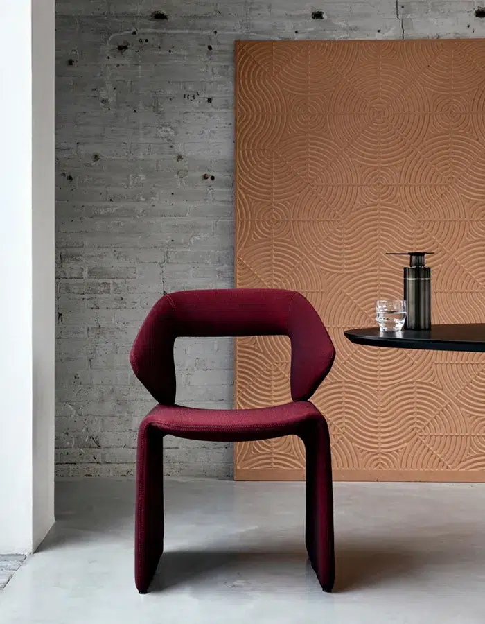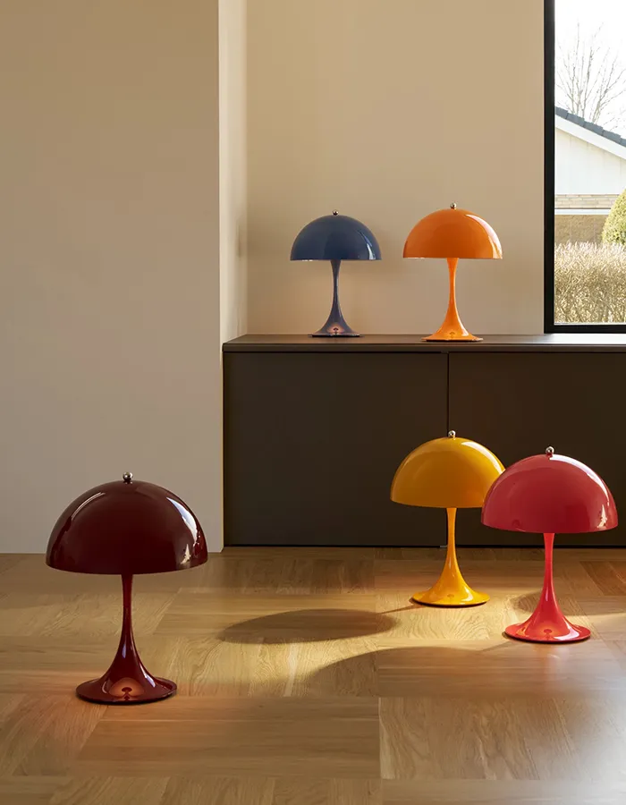 La teinte aubergine a ceci de rare qu’elle n’impose rien : elle suggère. Dans un salon, un simple fauteuil ou une lampe suffit à ponctuer l’espace. La lampe Panthella de Louis Poulsen, dans sa version prune, semble condenser la lumière elle-même : une bulle brillante qui contraste et dialogue avec les teintes moutarde, vert olive ou bleu Klein. Ce pouvoir d’association fait de l’aubergine une couleur-pont, capable de relier les esthétiques les plus opposées, du brutalisme au néo-rétro.