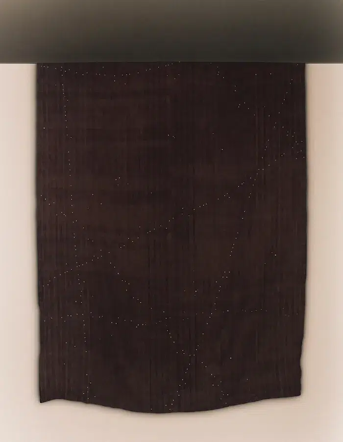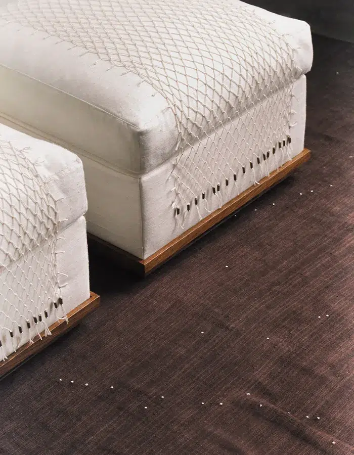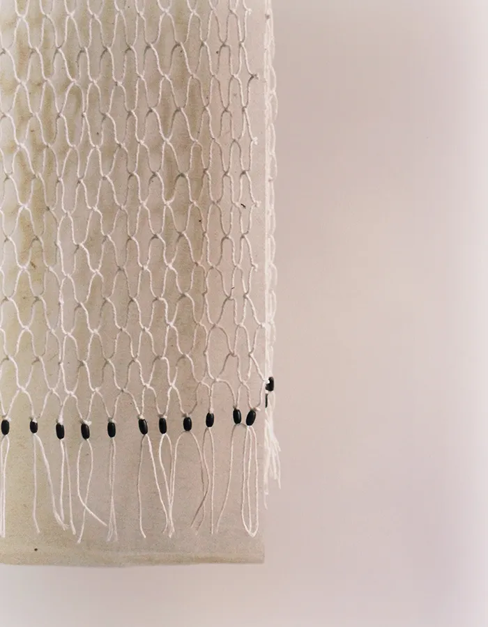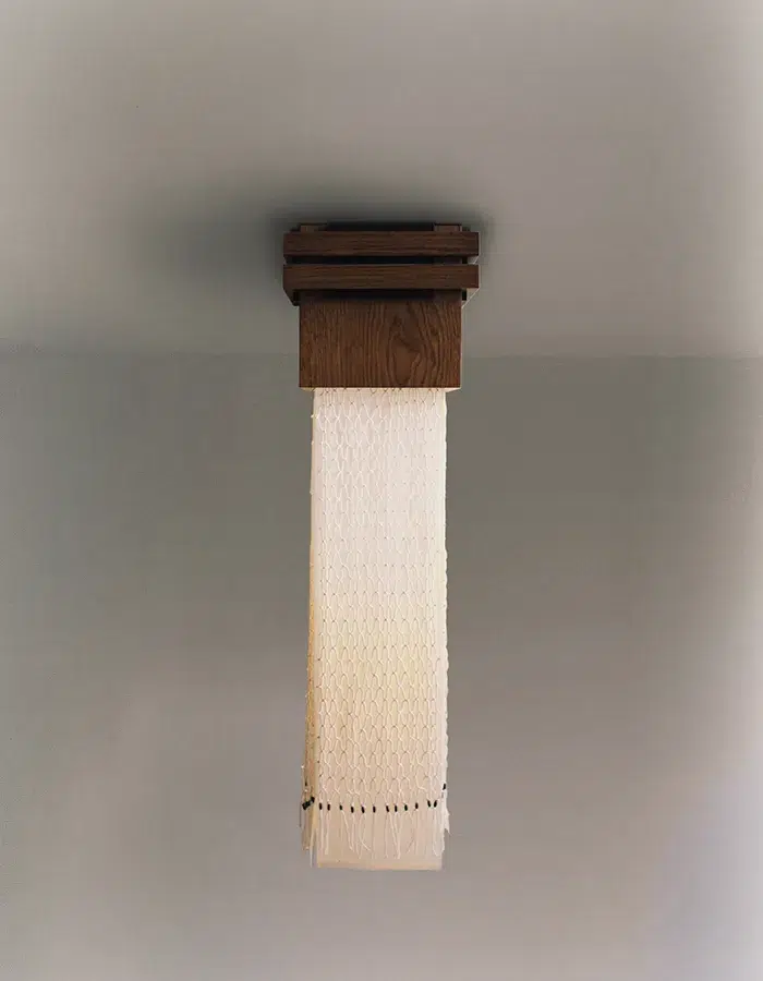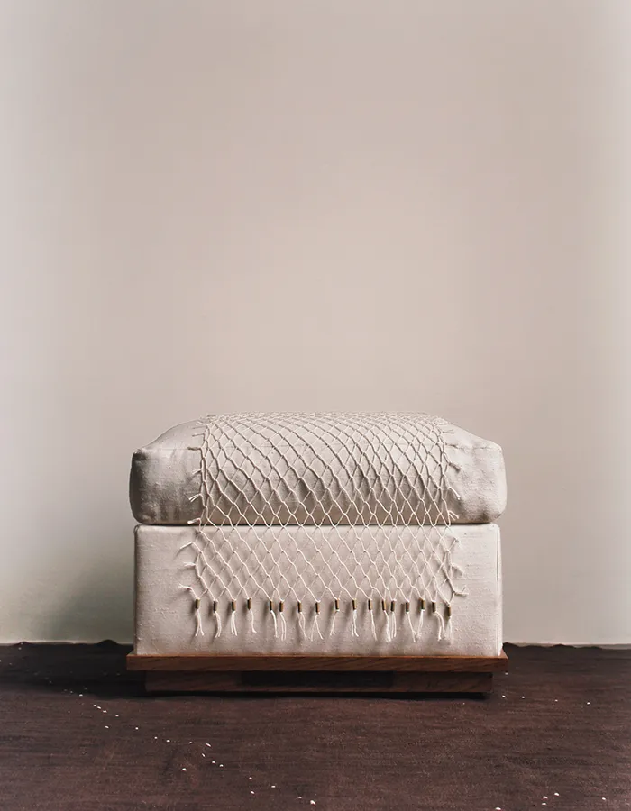 « Nous assumons une certaine brutalité dans le choix des matériaux et des textures, que nous venons ensuite sublimer par le détail, le geste artisanal et le travail de la lumière », affirme le tandem. Une approche qui se lit concrètement dans leurs pièces. L’ottoman est ainsi enveloppé d’un filet en coton ponctué de perles en laiton massif oxydé à la main. Le même principe se retrouve dans la lanterne, dont l’abat-jour se compose d’une gaze de coton enchâssée entre deux feuilles de papier, puis cirée à la cire d’abeille. Autant de détails minutieusement orchestrés qui révèlent l’écriture singulière de Coutansais Castillo. De quoi esquisser les contours d’un langage déjà affirmé, laissant entrevoir la suite de ce « Premier Acte ».