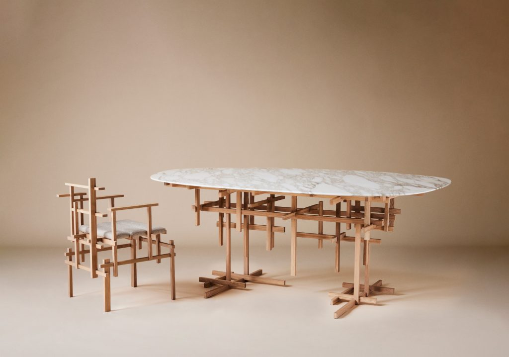 La collection « Migumi », née de la collaboration entre Kengo Kuma et Aman Interiors, a été conçue pour capturer « l’essence et l’interaction de la lumière du soleil et du bois ». La chaise, mais aussi la table comprennent une structure en bois inspirée du concept japonais de kigumi. Avec cette technique, les différents éléments sont associés les uns aux autres grâce à la sculpture de joints en bois qui permet de connecter les pièces entre elles sans nécessiter aucun clou ni autre fixation. Mélangeant les traditions de fabrication japonaises et une approche contemporaine et expérimentale, « Migumi » est fabriquée par des artisans experts à Higashikawa et destinée à rappeler quotidiennement nos liens profonds avec notre environnement.