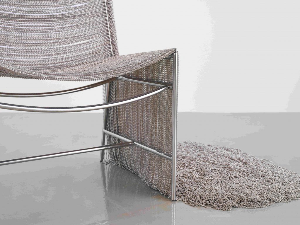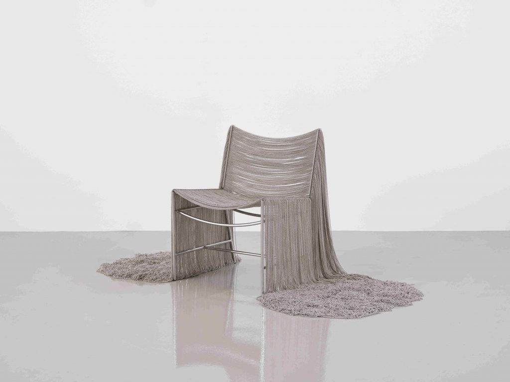 Après avoir créé son studio homonyme à Mexico en 2006, l’architecte Frida Escobedo a gagné en réputation en enchaînant les projets de qualité ; en 2018, la signature du pavillon d’architecture annuel de la Serpentine Gallery dans les jardins de Kensington à Londres a également contribué à asseoir sa notoriété, faisant d’elle la plus jeune architecte à se voir confier la réalisation de ce projet. Plus récemment, elle a été choisie pour concevoir la nouvelle aile moderne et contemporaine du Metropolitan Museum of Art de New York, devenant, encore une fois, la plus jeune et la première femme à élaborer un bâtiment pour l’institution. L’architecte mexicaine a profité de la grand-messe du design outre-Atlantique pour présenter une déclinaison du Creek Bench, la Creek Chair, une splendide pièce tout en légèreté, composée d’une structure en acier inoxydable, habillée par des chaînes de nickel.