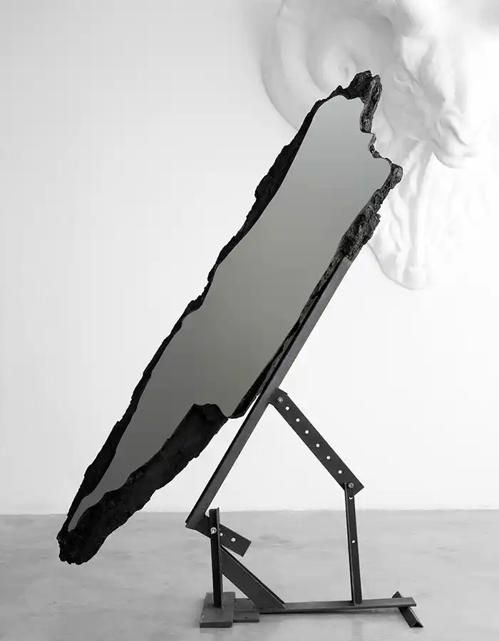 À l’aide de fines couches de laque brillante, la structure en bois – fabriquée au Portugal – dégage une intensité chromatique certaine et met en lumière les formes singulières de cette pièce de mobilier.