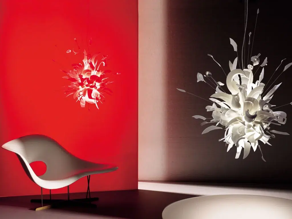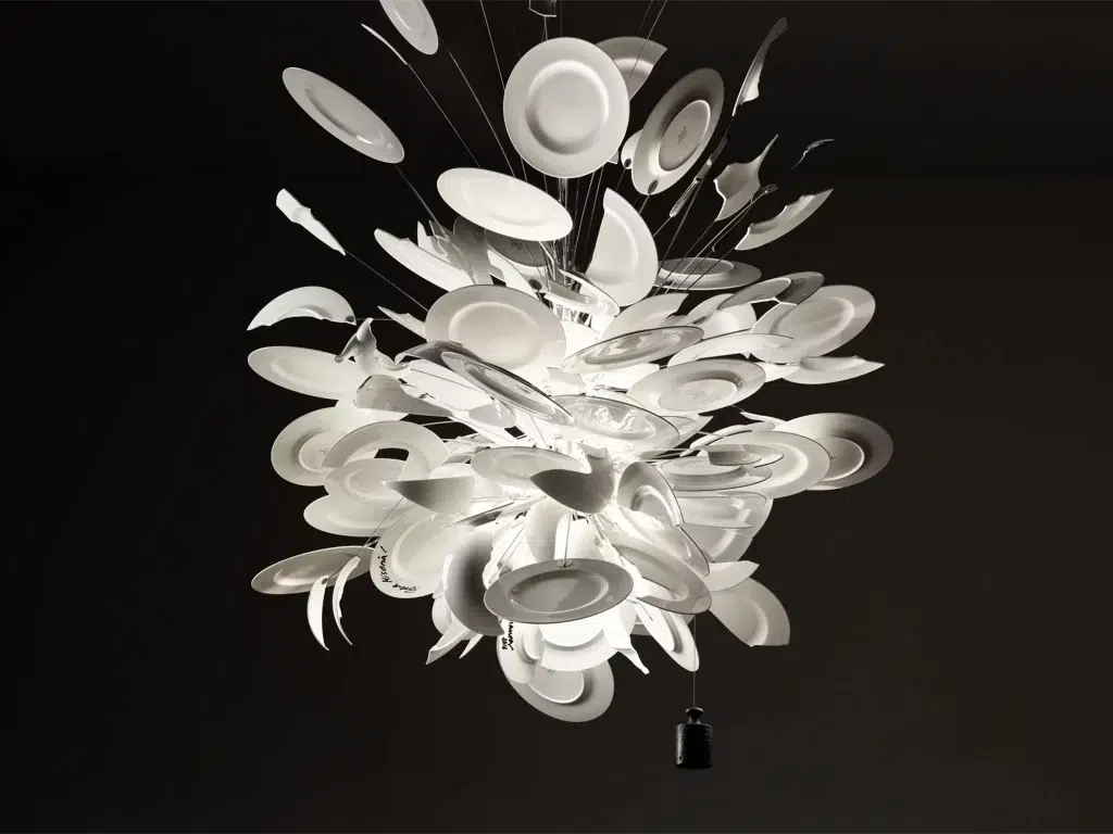 Créé en 1994, Porca Miseria! est la parfaite illustration de cette recherche. Plus qu’une suspension, l’oeuvre se présente comme un fantastique objet lumineux en expansion. Quatre personnes sont nécessaires pour monter ce luminaire composé de pièces de service en porcelaine brisées et de couverts, figés dans une explosion cinématographique. La lumière se fraye un chemin à travers les tessons en lévitation, joue avec leur matière translucide et les sculpte à son passage. Seuls 10 luminaires sur mesure sont produits chaque année, adaptés à l’espace qu’ils occuperont et personnalisés au goût de leurs futurs propriétaires, qui peuvent y apporter leur touche personnelle.