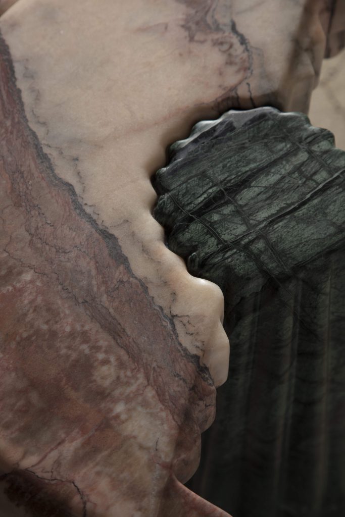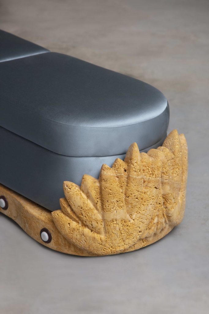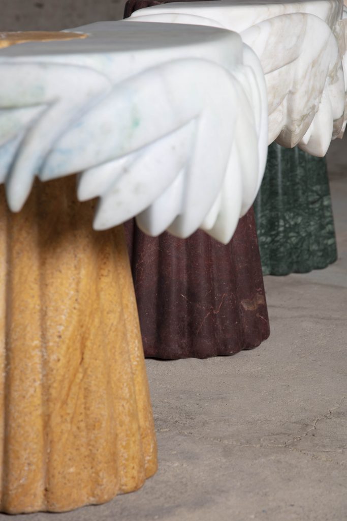 Autre proposition milanaise, la collection « The Lotus Series », projet démarré il y a cinq ans, se présente comme une exploration des expressions architecturales de la fameuse fleur. El Mays a commencé par sculpter du bois et du marbre, comme pour retrouver cette sensation visuelle propre à l’univers du bâti. L’objectif était alors d’étudier la meilleure façon de créer des œuvres influencées par une forme originale, à la fois ancrées dans le présent et projetées dans le futur, loin de toute nostalgie. Le designer s’est alors tourné vers la fleur de lotus, omniprésente dans l’ordre architectural et les peintures murales de l’Égypte ancienne. Il a choisi de revisiter la fleur en déformant sa silhouette initiale pour lui donner des ailes. Une expérience de recherche esthétique qui s’est vue déclinée à travers une myriade de marbres – des tables, des guéridons ou encore une élégante assise de satin gris – qui semblent à la fois perdus dans les méandres de notre chronologie esthétiques et résolument contemporains.