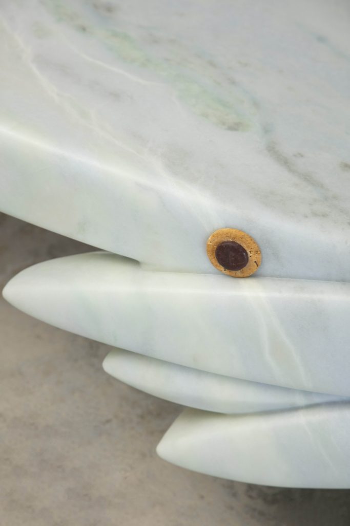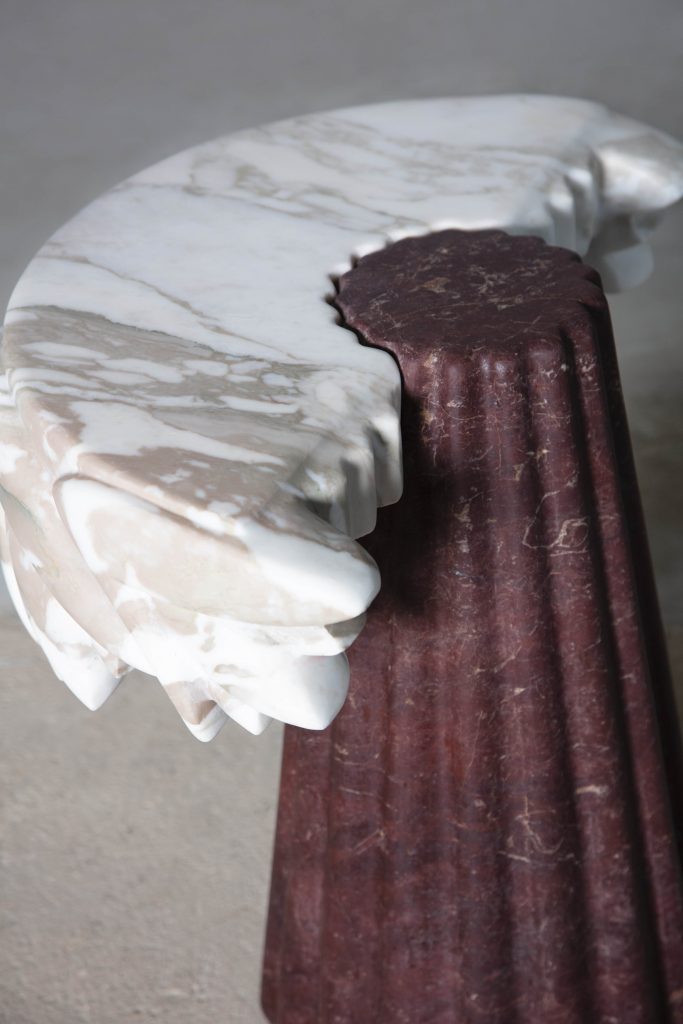 Autre proposition milanaise, la collection « The Lotus Series », projet démarré il y a cinq ans, se présente comme une exploration des expressions architecturales de la fameuse fleur. El Mays a commencé par sculpter du bois et du marbre, comme pour retrouver cette sensation visuelle propre à l’univers du bâti. L’objectif était alors d’étudier la meilleure façon de créer des œuvres influencées par une forme originale, à la fois ancrées dans le présent et projetées dans le futur, loin de toute nostalgie. Le designer s’est alors tourné vers la fleur de lotus, omniprésente dans l’ordre architectural et les peintures murales de l’Égypte ancienne. Il a choisi de revisiter la fleur en déformant sa silhouette initiale pour lui donner des ailes. Une expérience de recherche esthétique qui s’est vue déclinée à travers une myriade de marbres – des tables, des guéridons ou encore une élégante assise de satin gris – qui semblent à la fois perdus dans les méandres de notre chronologie esthétiques et résolument contemporains.