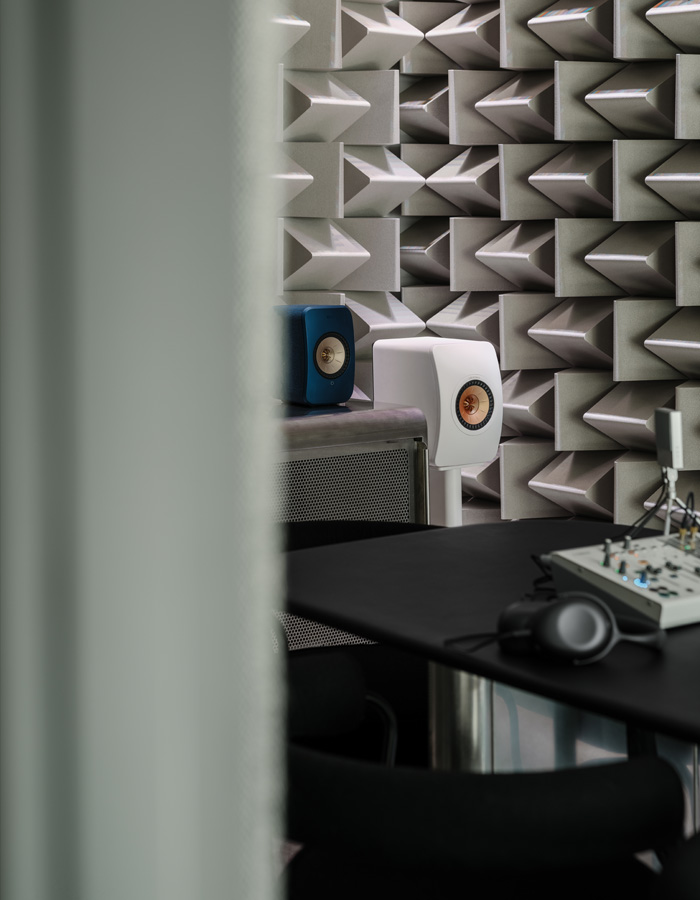 Le « Studio », inspiré de la chambre anéchoïque du centre R&D de KEF à Maidstone, se veut un espace intime adjacent à la Galerie. Cette salle, équipée d’un son acoustique de pointe, est mise à disposition des musiciens, des artistes et des collaborateurs. Son approche multifonction sert de studio de podcast, d’espace d’enregistrement ou de lieu intime pour l’écoute.