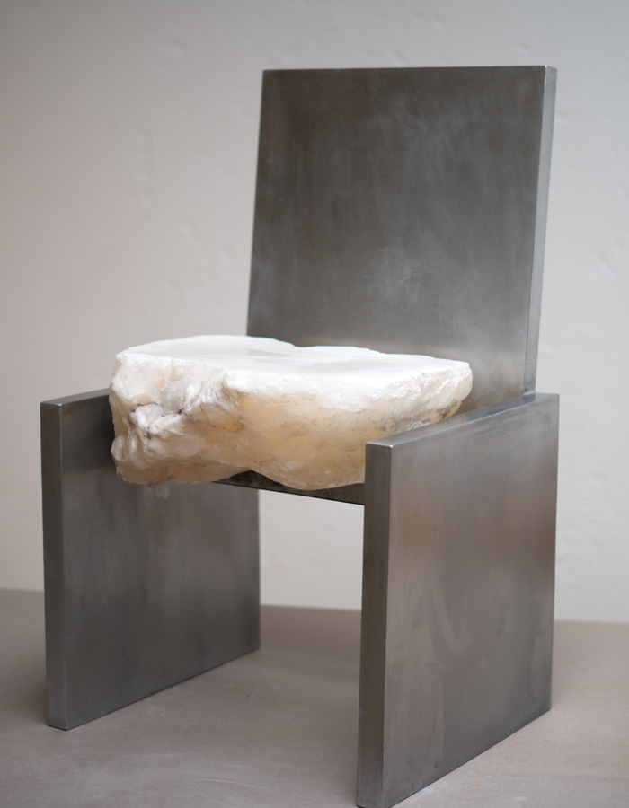 Autre collection à ne pas manquer, « Foreign Bodies », inspirée des satellites envoyés dans l’espace pour analyser la composition matérielle des corps extraterrestres. « Le processus d’exploration spatiale illustre notre dépendance aux matériaux en tant qu’espèce et l’influence qu’ils ont sur notre conscience », explique le créateur. Le luminaire et la chaise évoquent l’étape « ARRIVAL », quand nos objets terrestres entrent en contact avec l’étranger, soit le début de notre relation symbiotique avec ces corps célestes. Les pièces de mobilier évoquent des robots envoyés vers ces corps extraterrestres, échantillonnant et étudiant les matériaux de cet autre monde. Mystérieuses et inquiétantes, les créations de Collin Townsend Velkoff sont à découvrir de toute urgence.