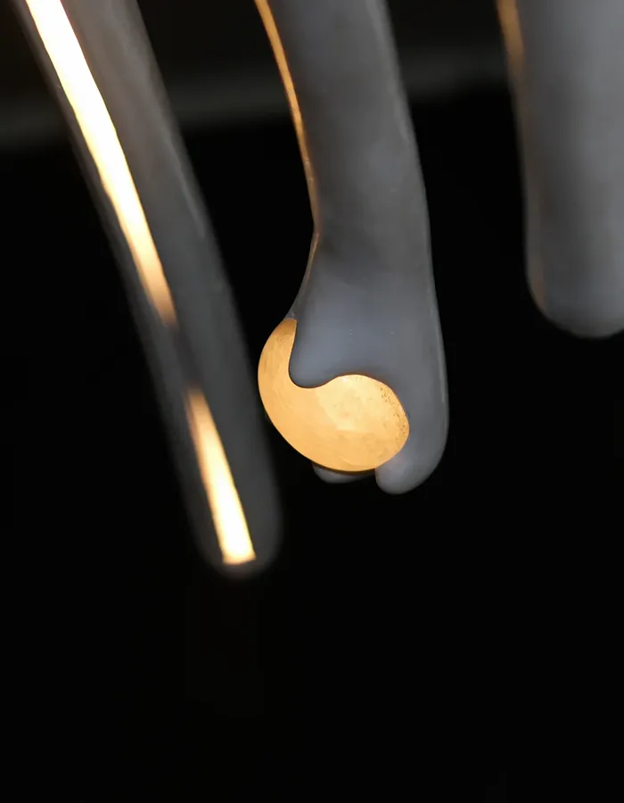 Chaque pièce commence par des mèches de laine mérinos et de mohair plongées dans des bains d’acide coloré. La fibre cardée est ensuite feutrée à l’aiguille, puis appliquée sur une armature en cèdre, geste répété pendant des semaines jusqu’à obtenir ces reliefs qui évoquent coraux, cactées ou spores flottants. L’artiste aime la souplesse de ce matériau qui peut devenir tendre ou dense selon sa densité et garde la chaleur d’une peau.