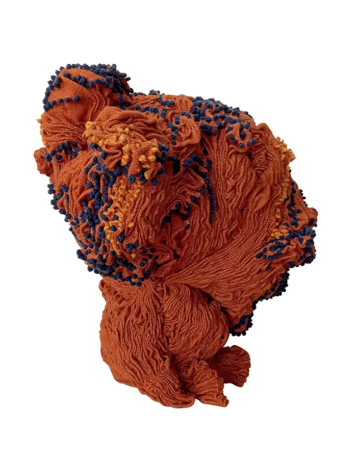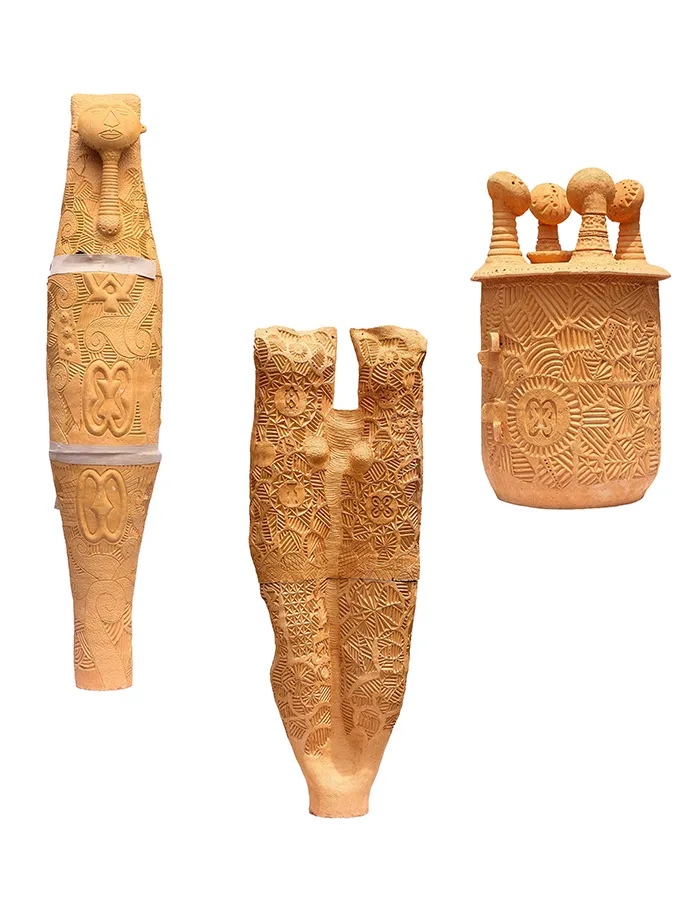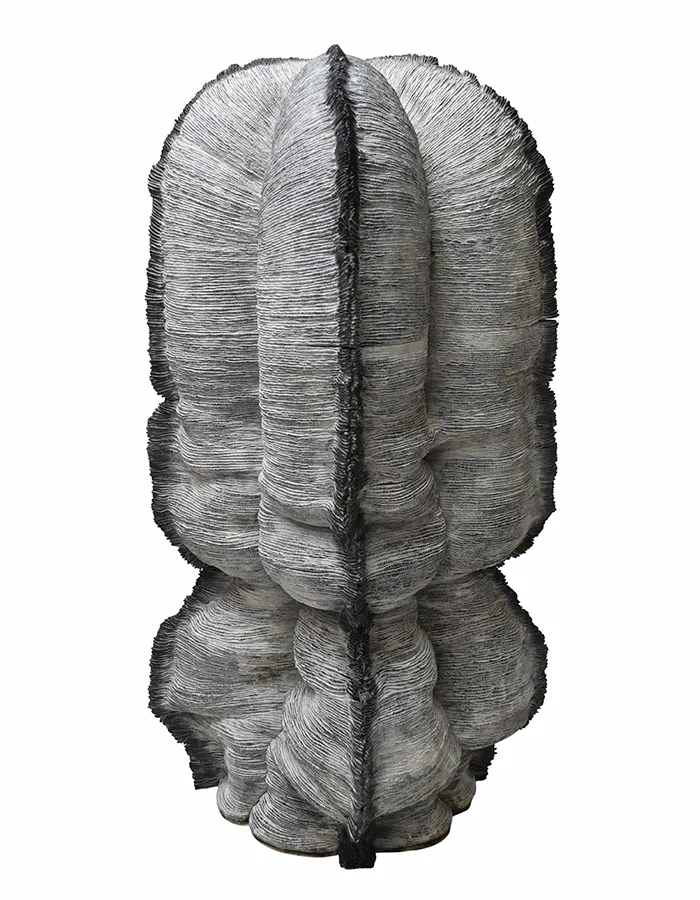 Le designer nigérian Nifemi Marcus-Bello repousse les limites de l’éco-conception avec un banc sculpté en aluminium recyclé. Kunimasa Aoki, quant à lui, joue sur les textures en intégrant terre et graphite dans ses céramiques aux formes sinueuses. Kobina Adusah propose une œuvre inspirée des rites funéraires : un sarcophage en terre cuite strié de motifs organiques et entouré de bandes de textile.