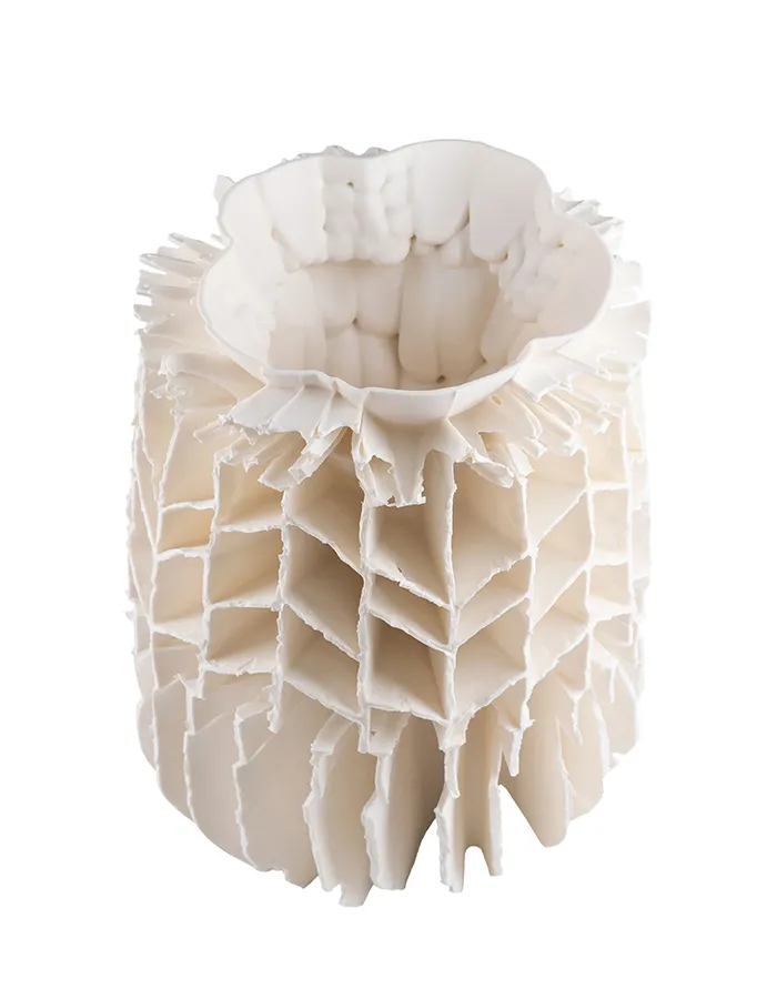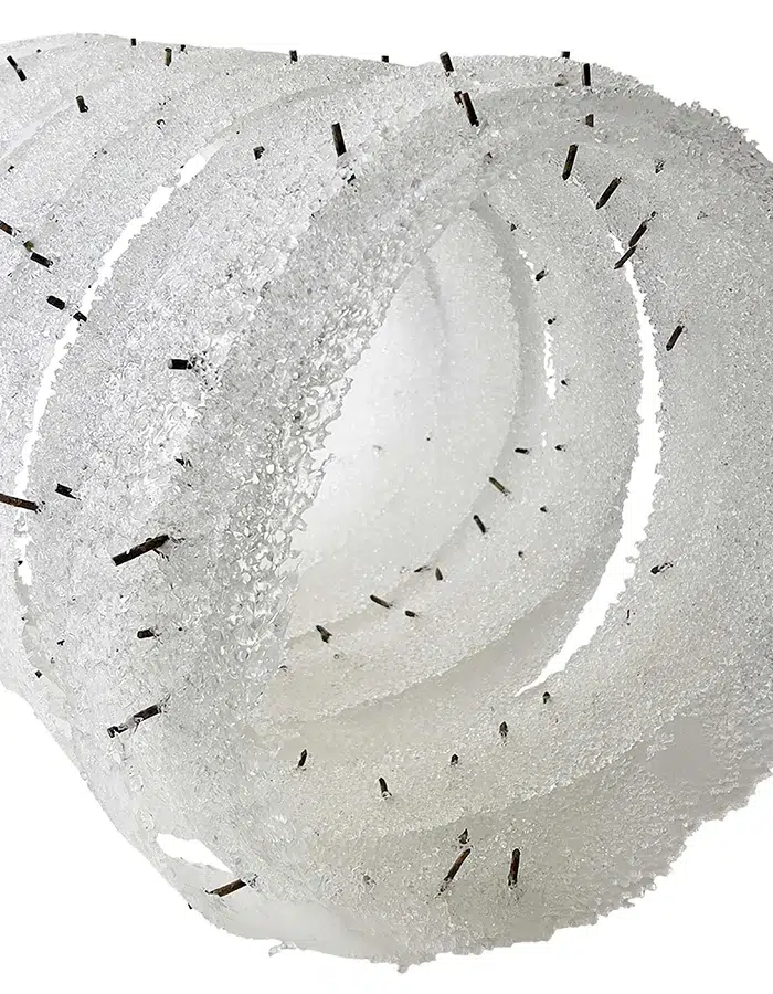 L’artiste coréen Jungin Lee métamorphose le hanji, un papier traditionnel, en un fauteuil nuageux, assemblé à l’aide de colle et de farine. À l’opposé, Mikio Ishiguro crée une boîte d’une finesse extrême, sculptée à partir de feuilles finement broyées.